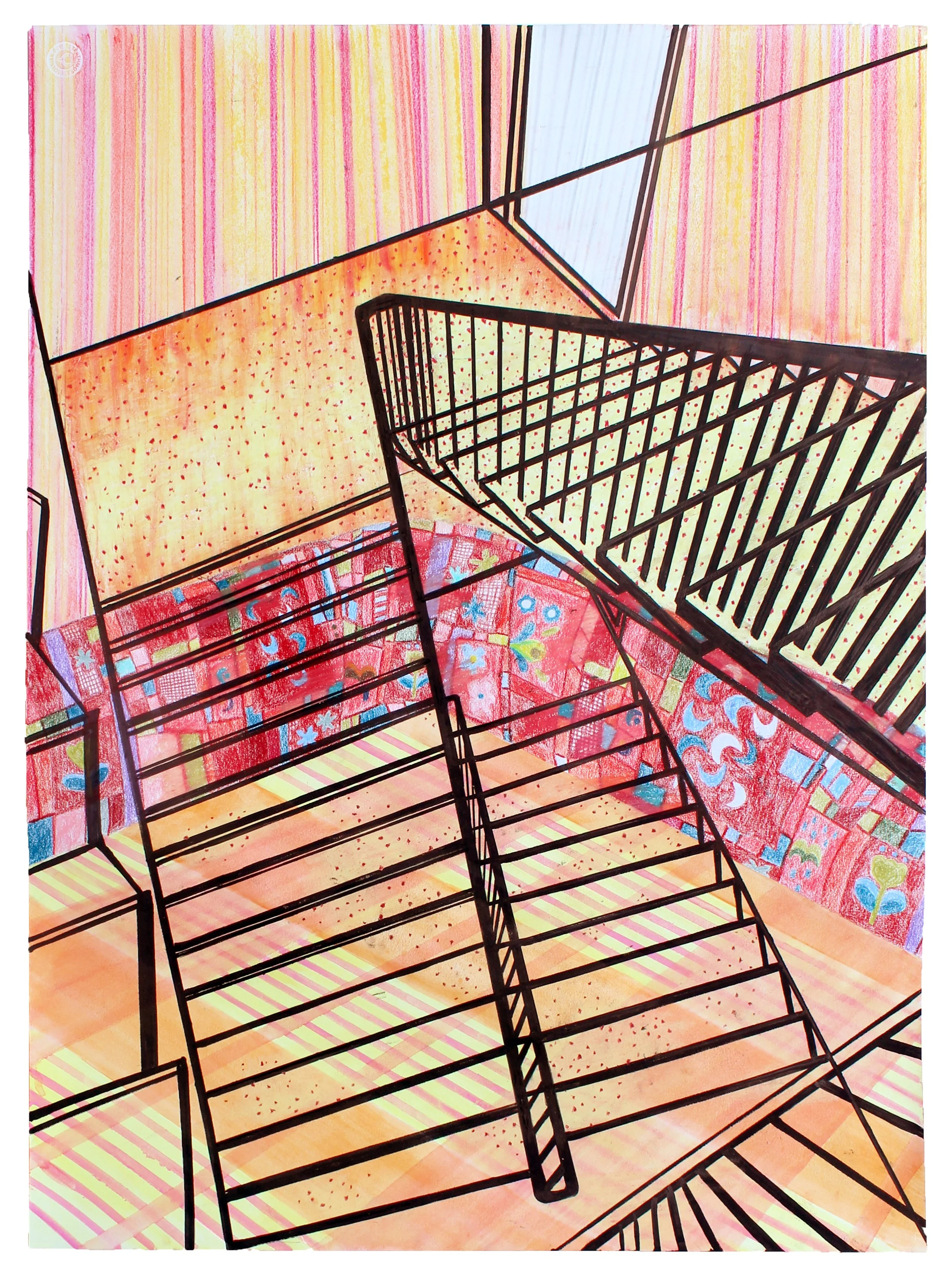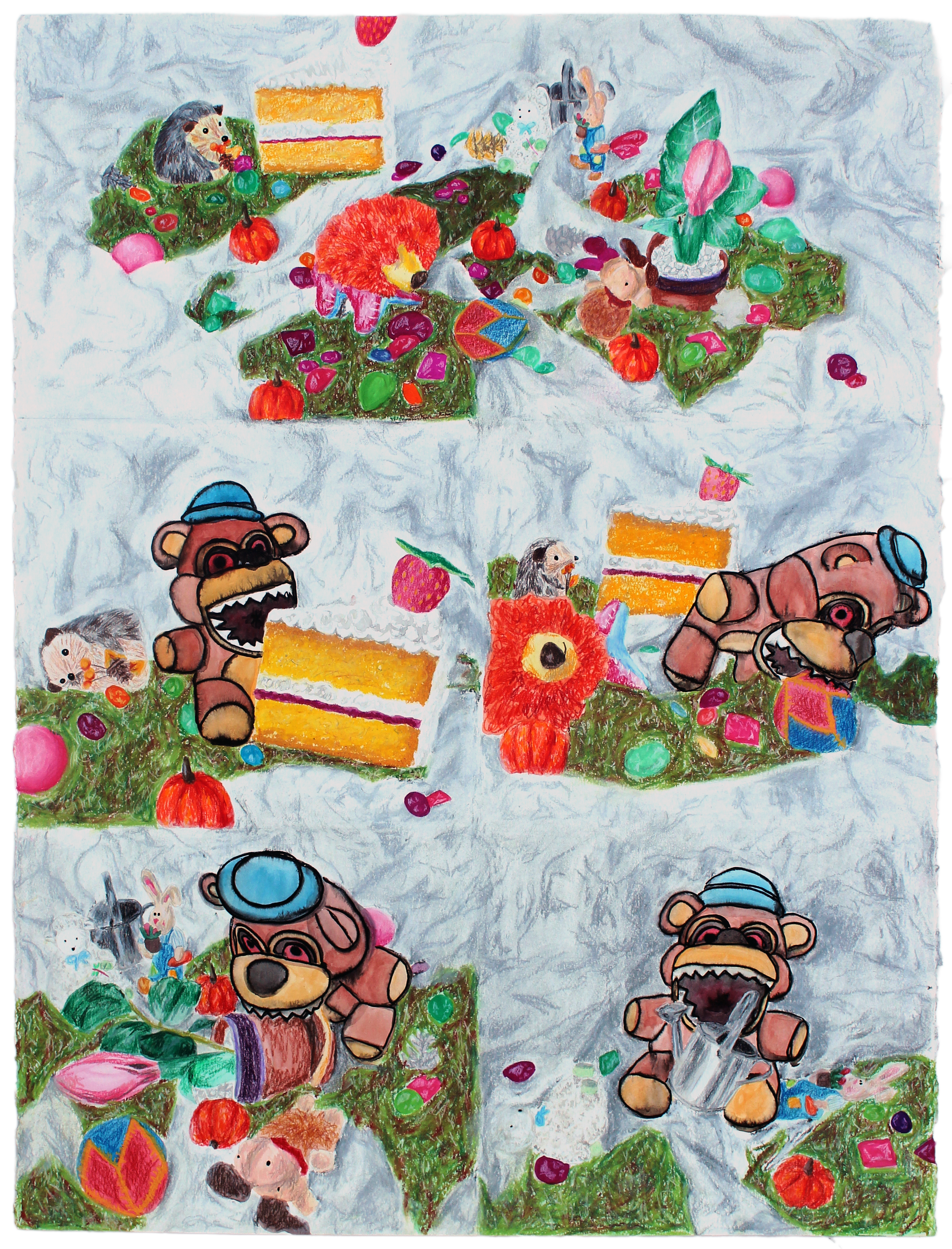 colored pencil, oil pastel, watercolor, and charcoal on watercolor paper