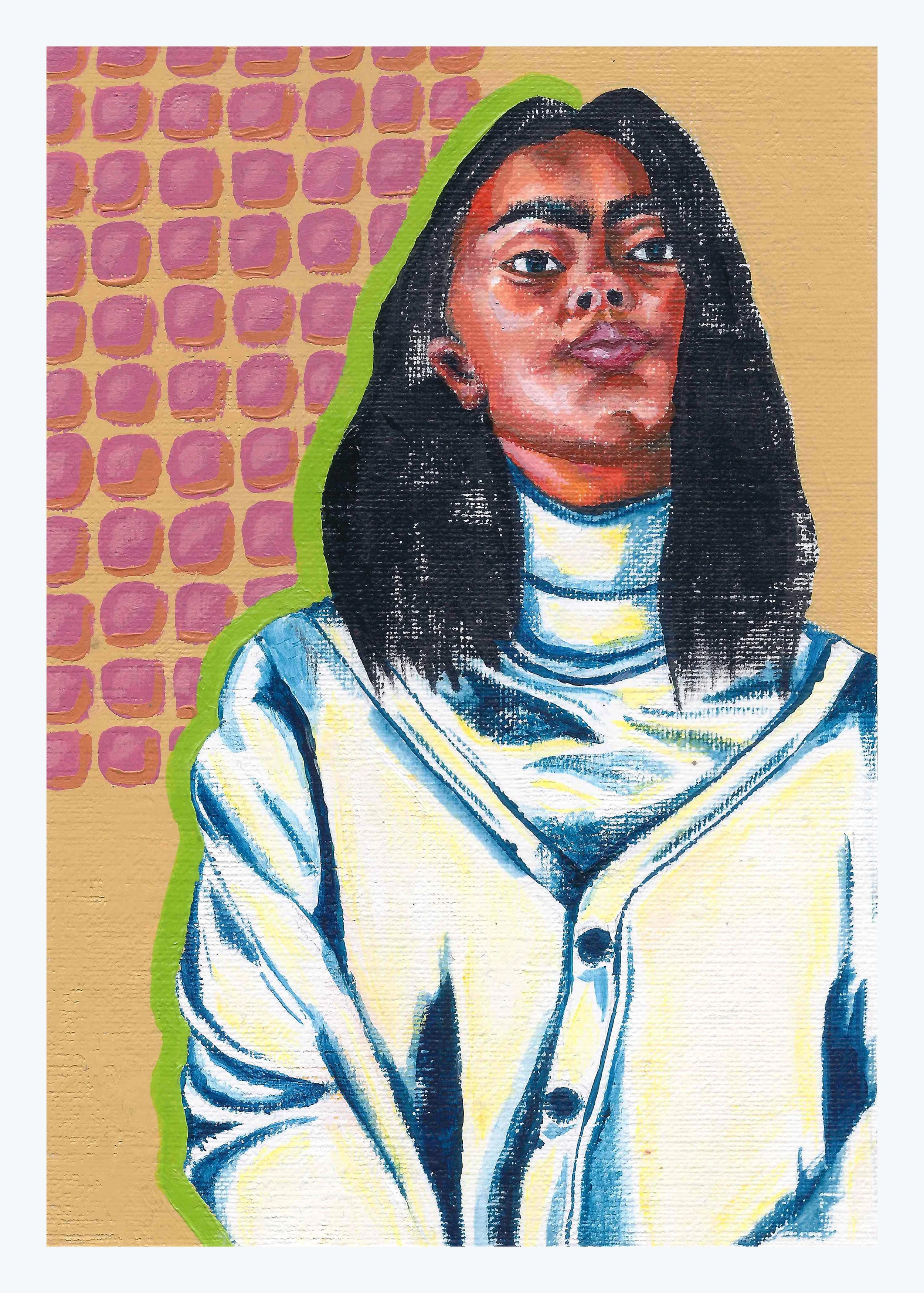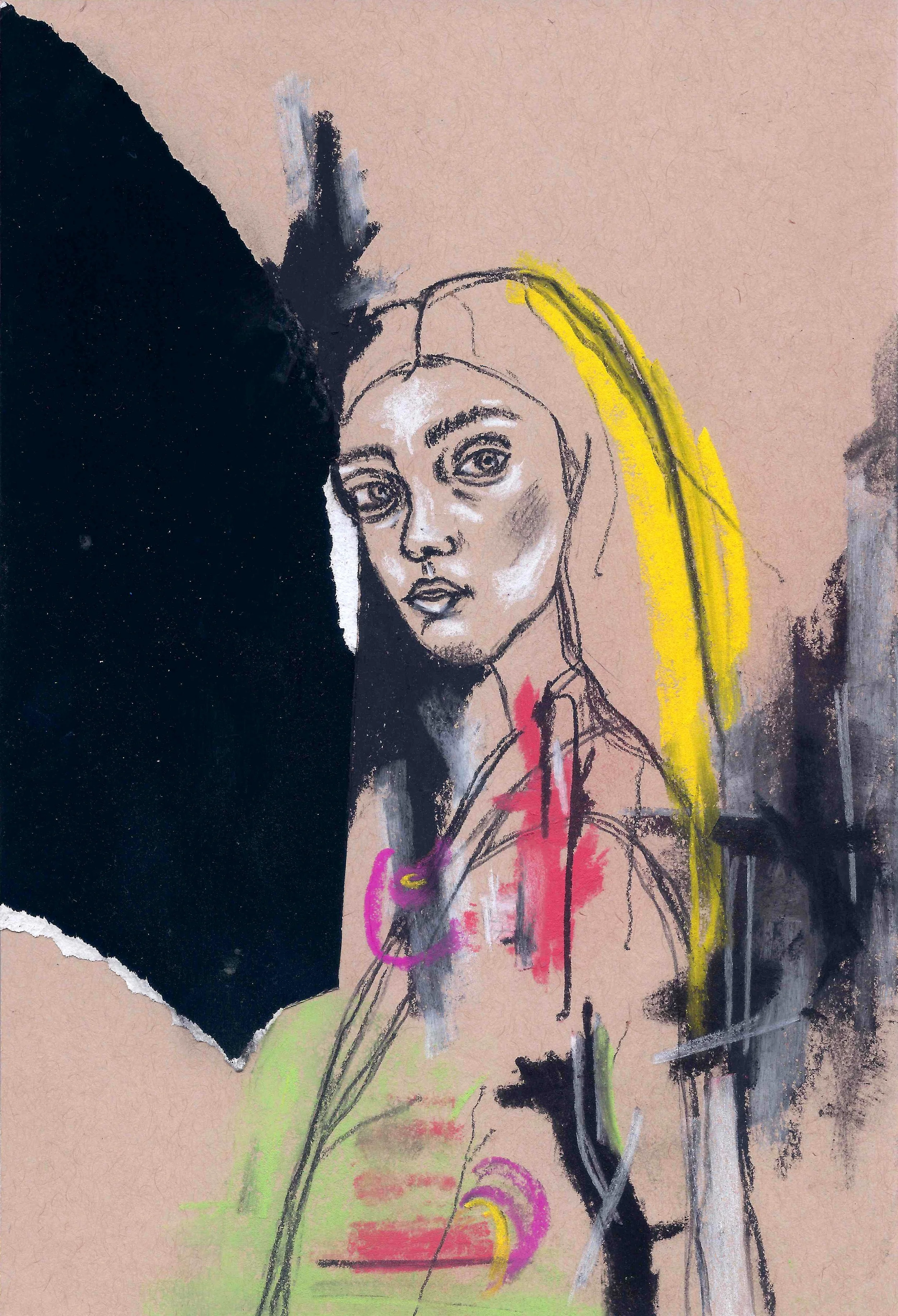 Acrylic, chalk pastel, marker, and colored pencil on canvas board