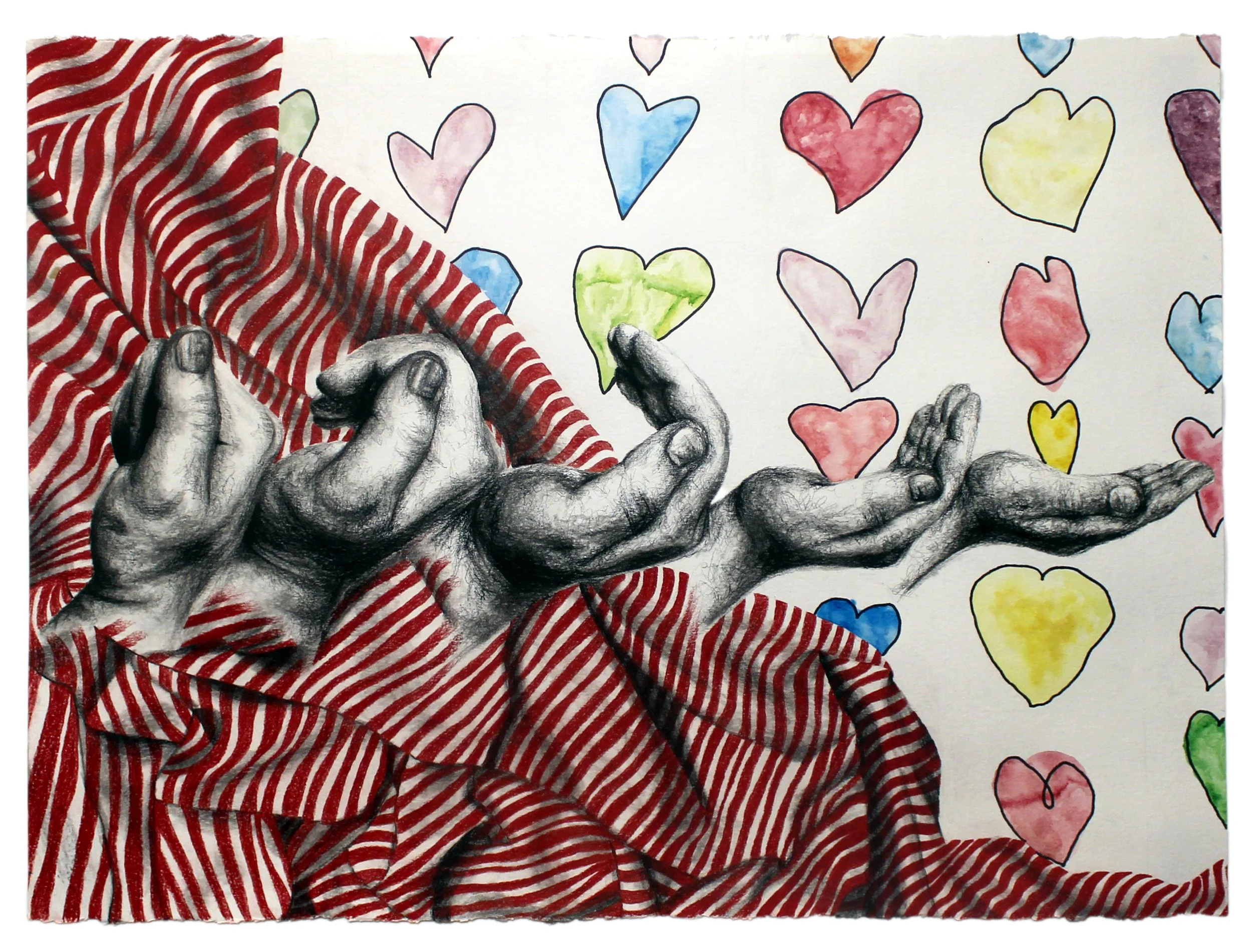 Charcoal, colored pencil, watercolor, and pen on watercolor paper