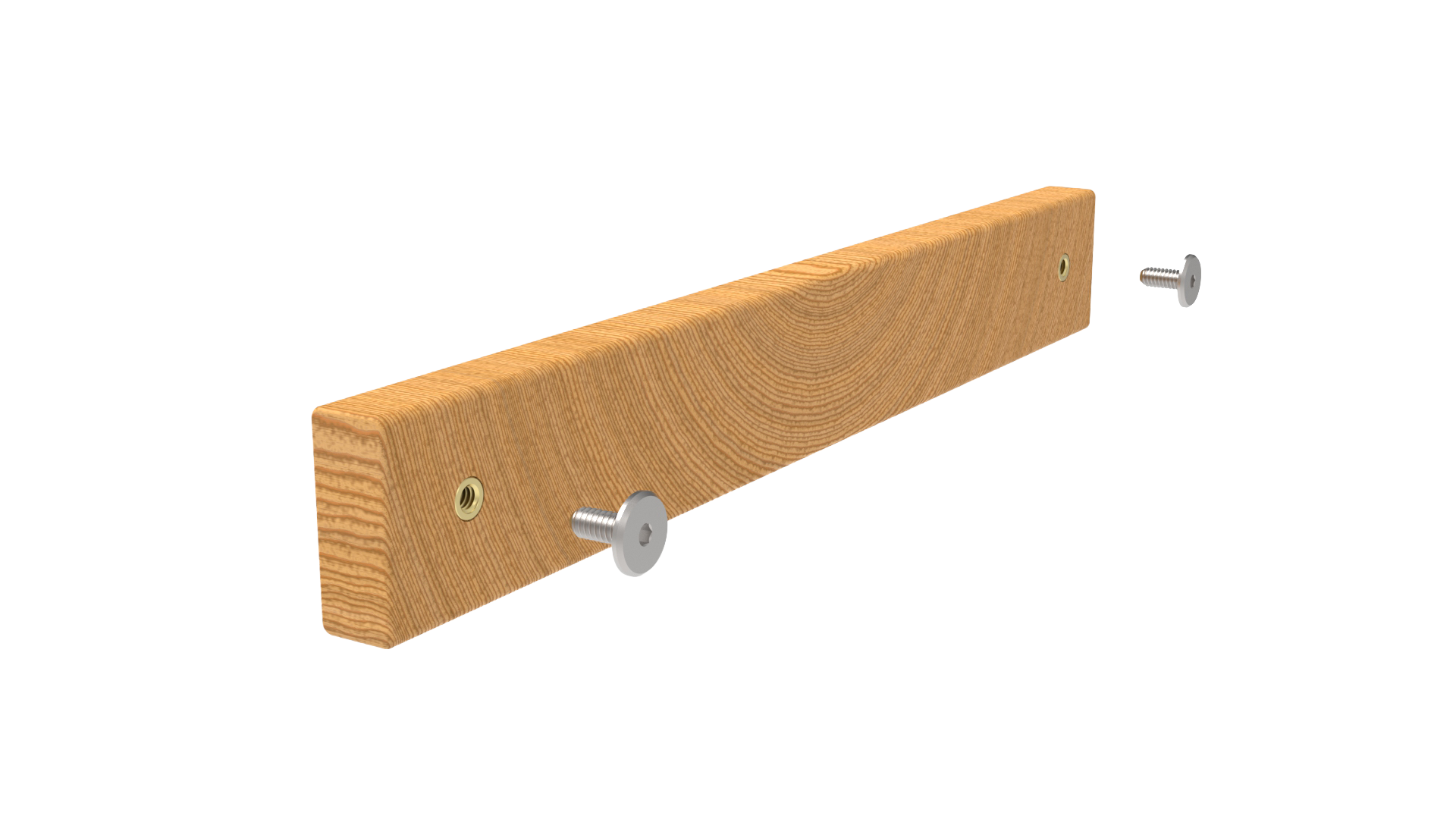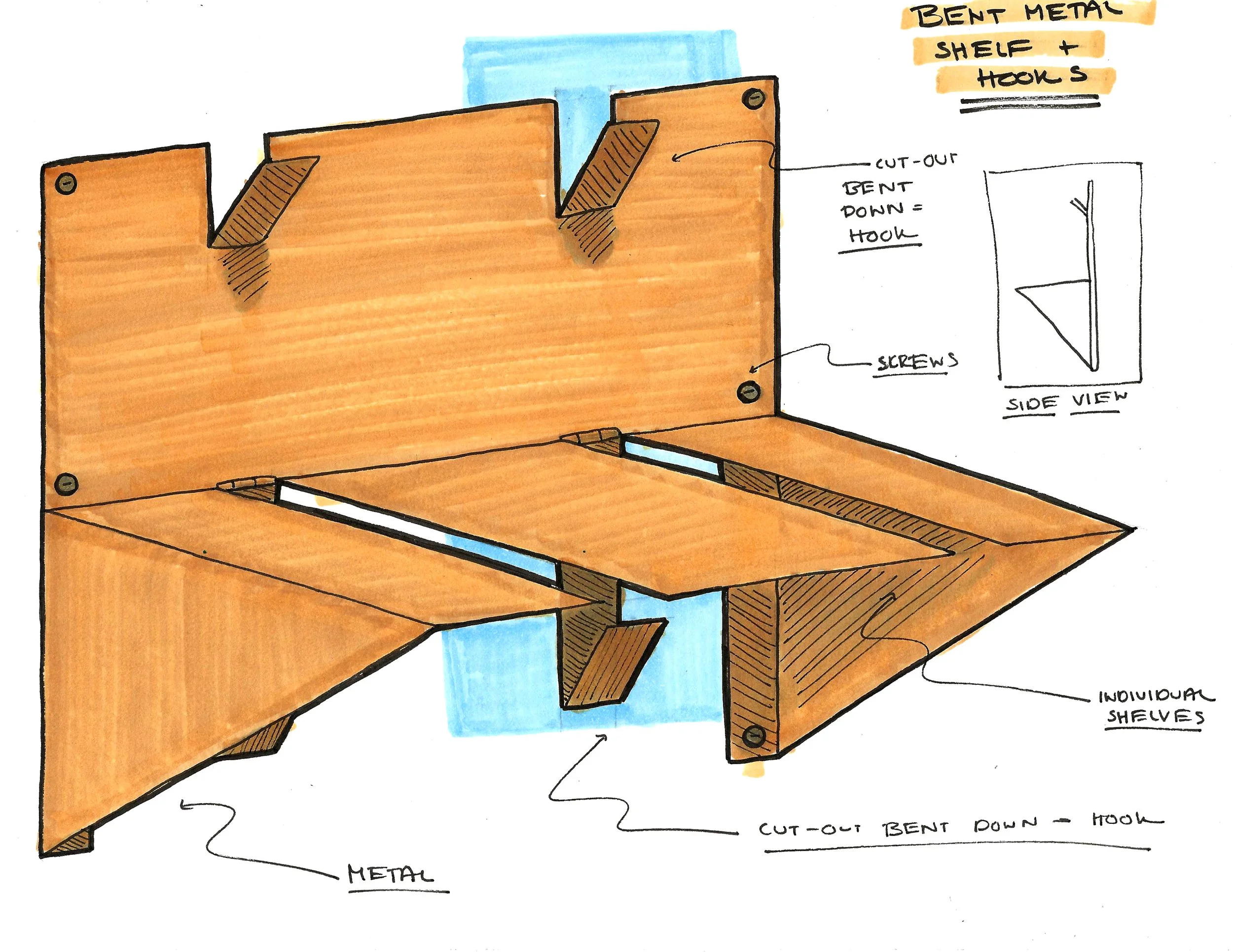 a wood block is secured to the wall, and a bent metal shelf is attached with hex drive connecting screws