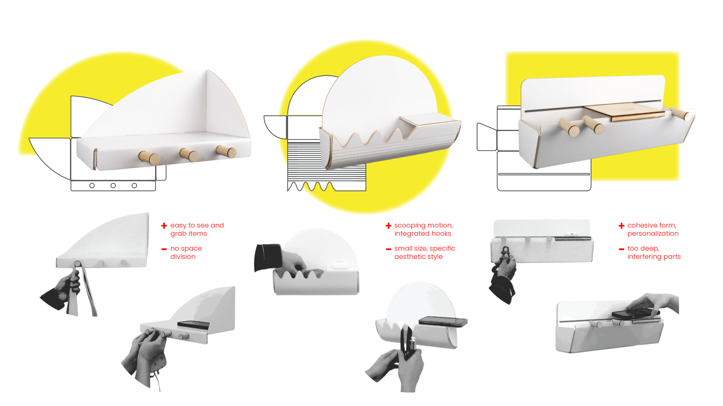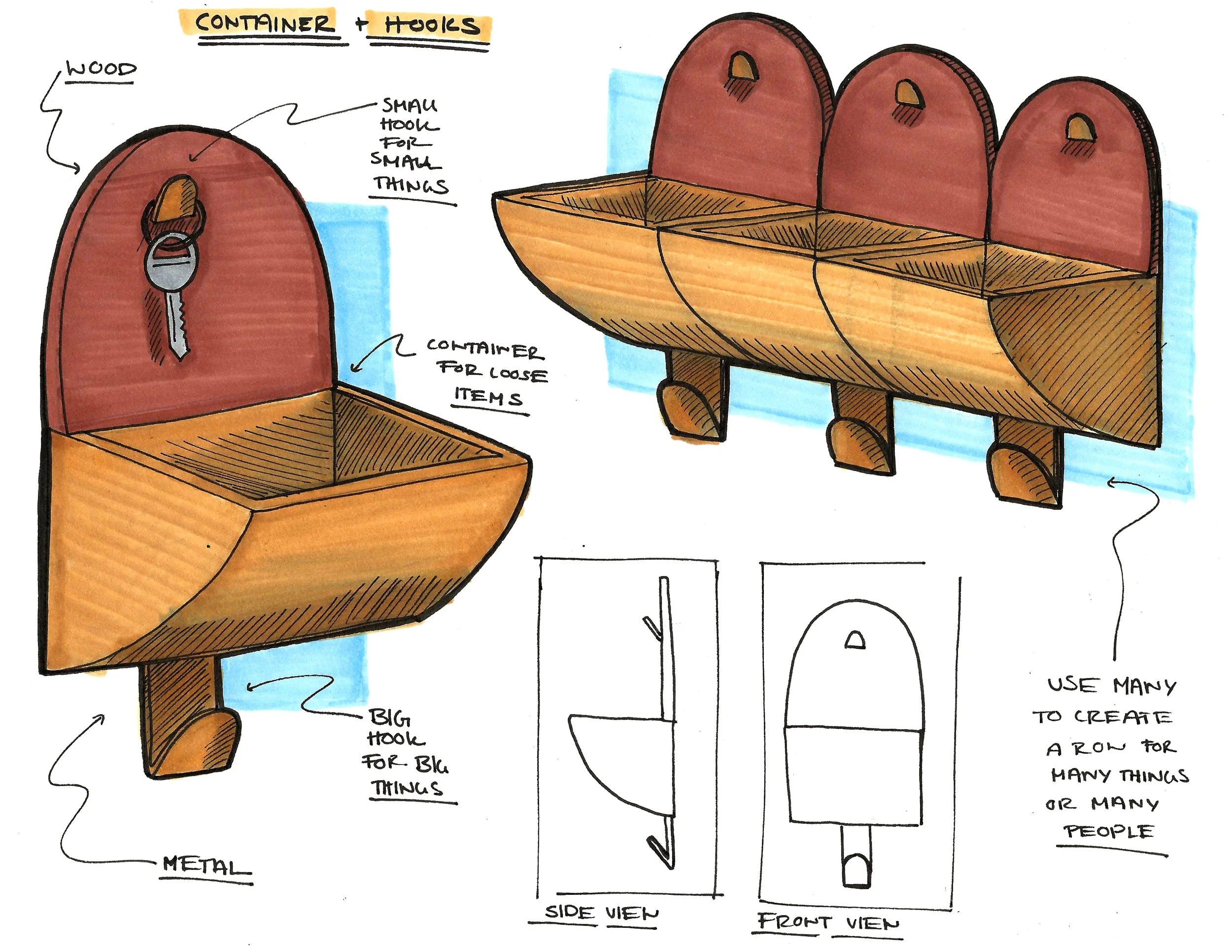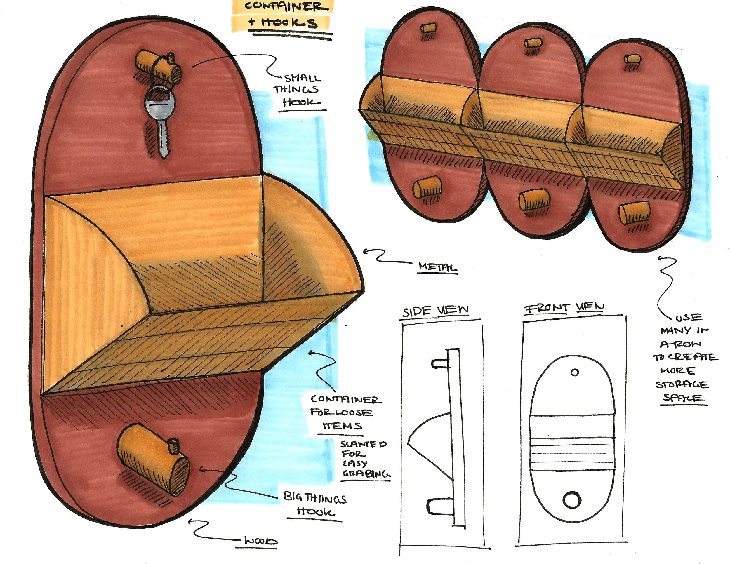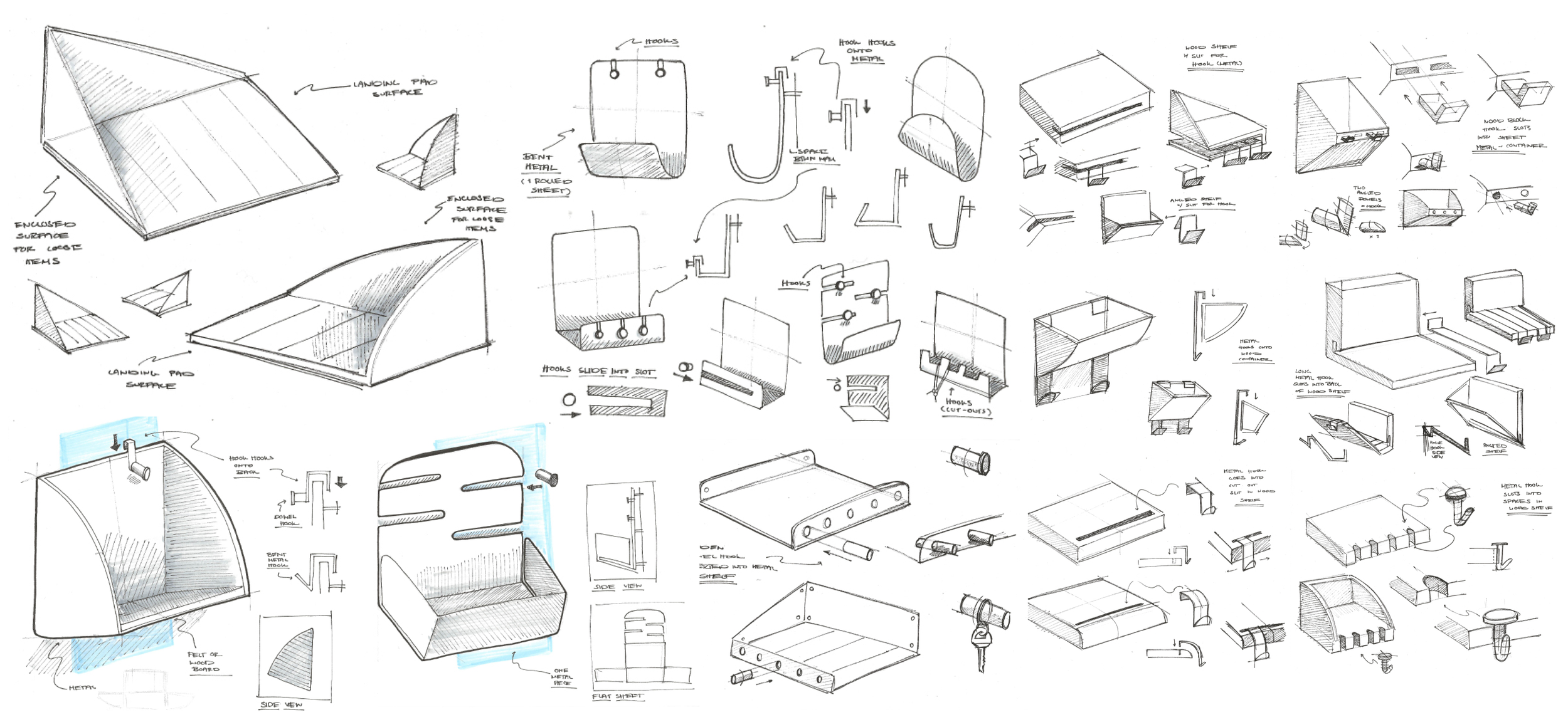 I needed to combine a shallow container, different hook sizes, and a “landing pad” surface. I continued to model in CAD to create flat patterns used to laser cut and score foam core which I folded into scale prototypes. I tested different wood attachments and slight variations in form.
