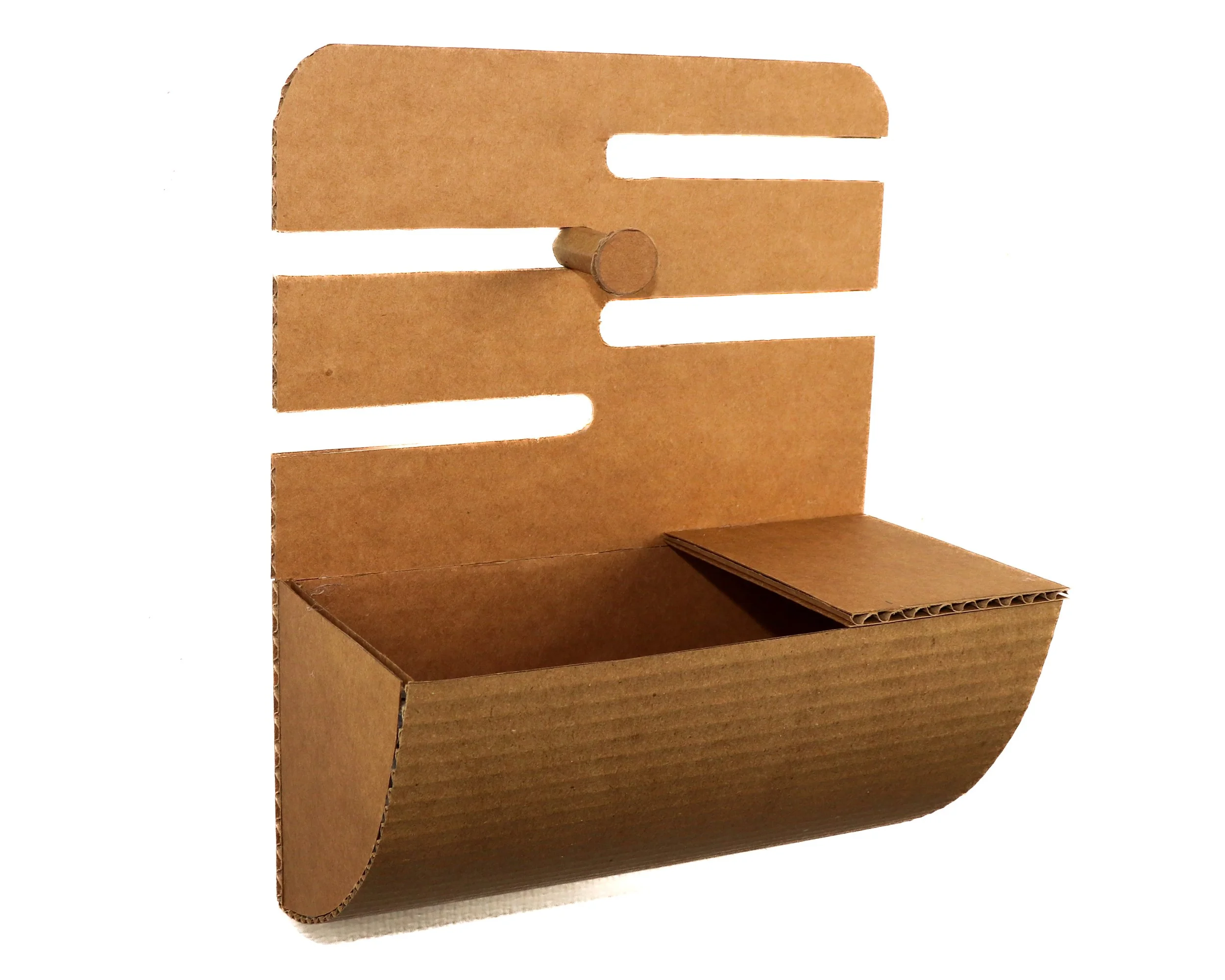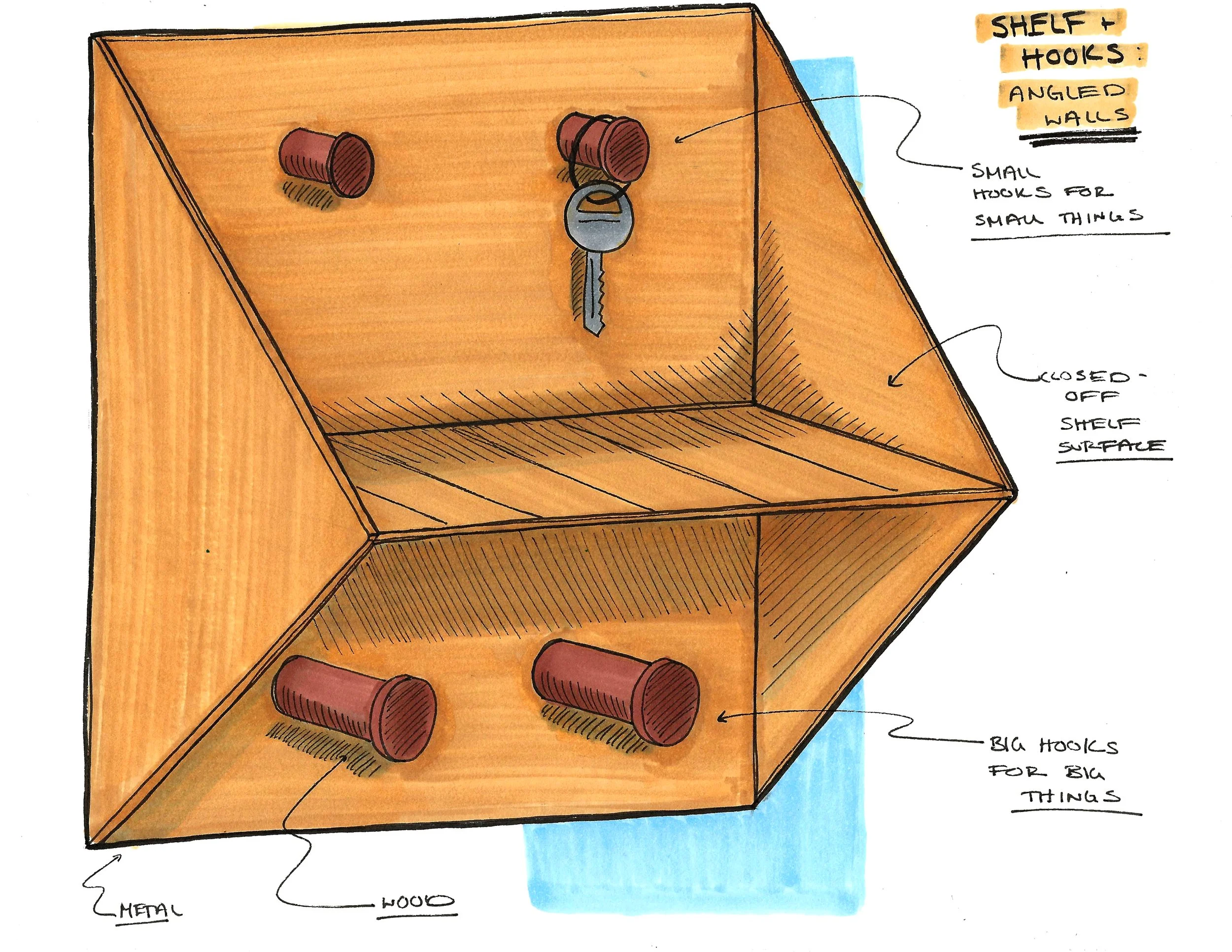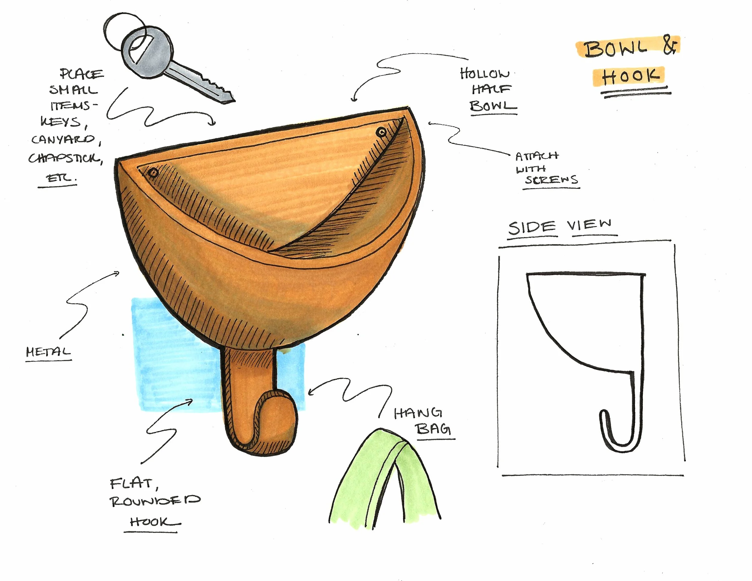 I needed to combine a shallow container, different hook sizes, and a “landing pad” surface. I continued to model in CAD to create flat patterns used to laser cut and score foam core which I folded into scale prototypes. I tested different wood attachments and slight variations in form.