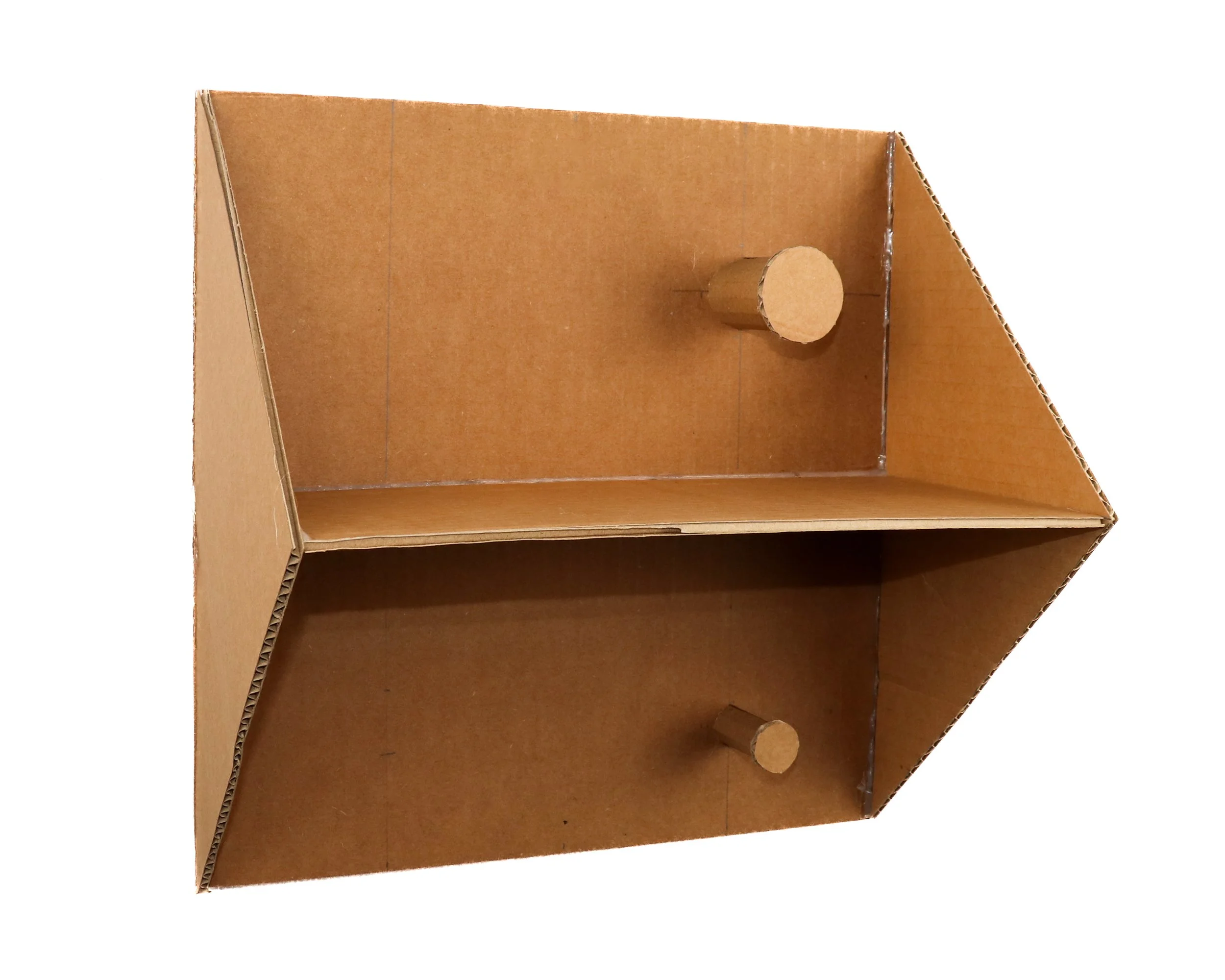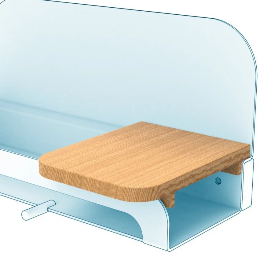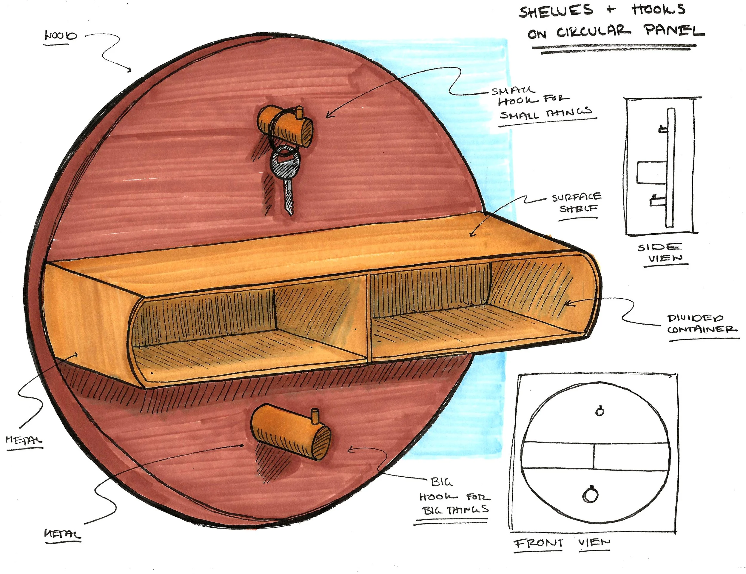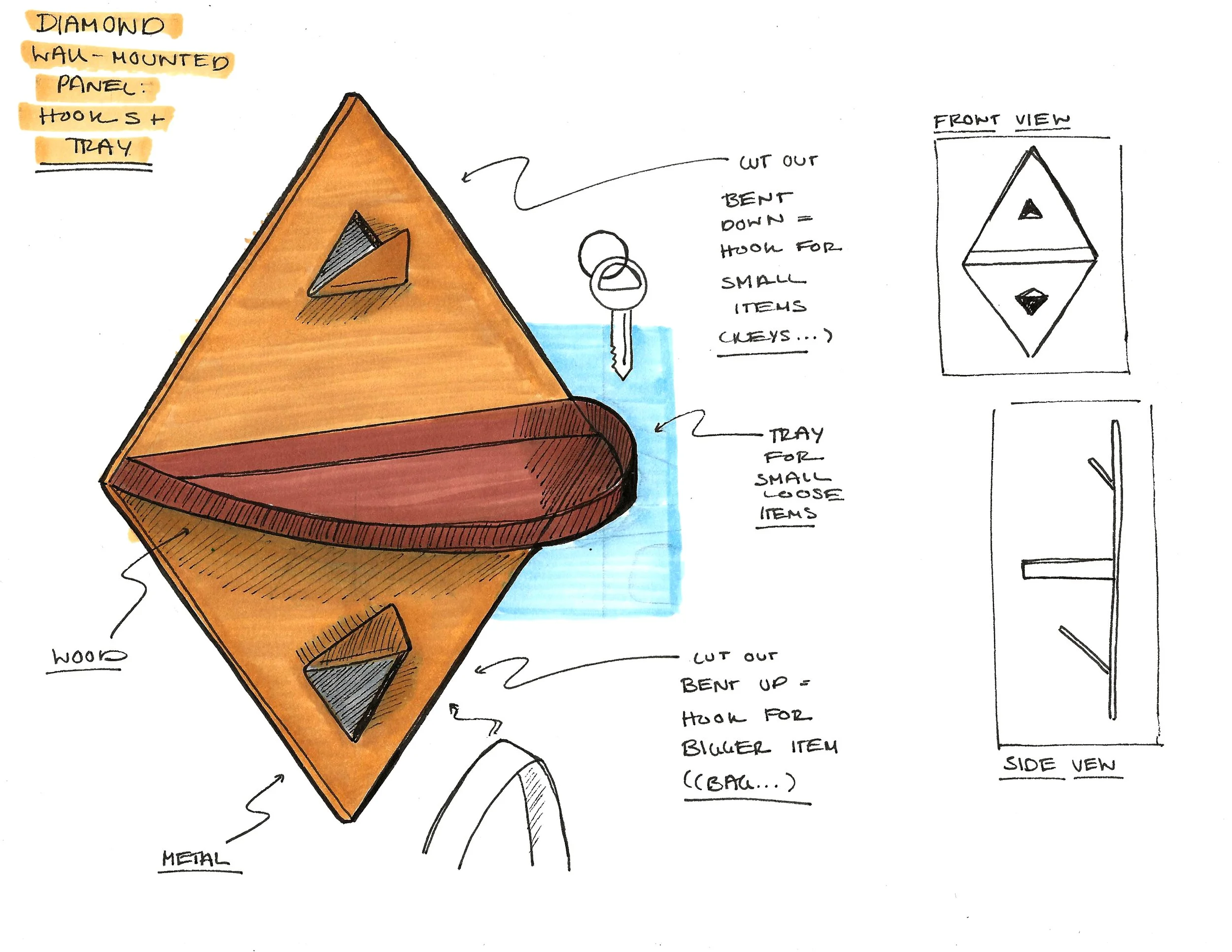 I needed to combine a shallow container, different hook sizes, and a “landing pad” surface. I continued to model in CAD to create flat patterns used to laser cut and score foam core which I folded into scale prototypes. I tested different wood attachments and slight variations in form.