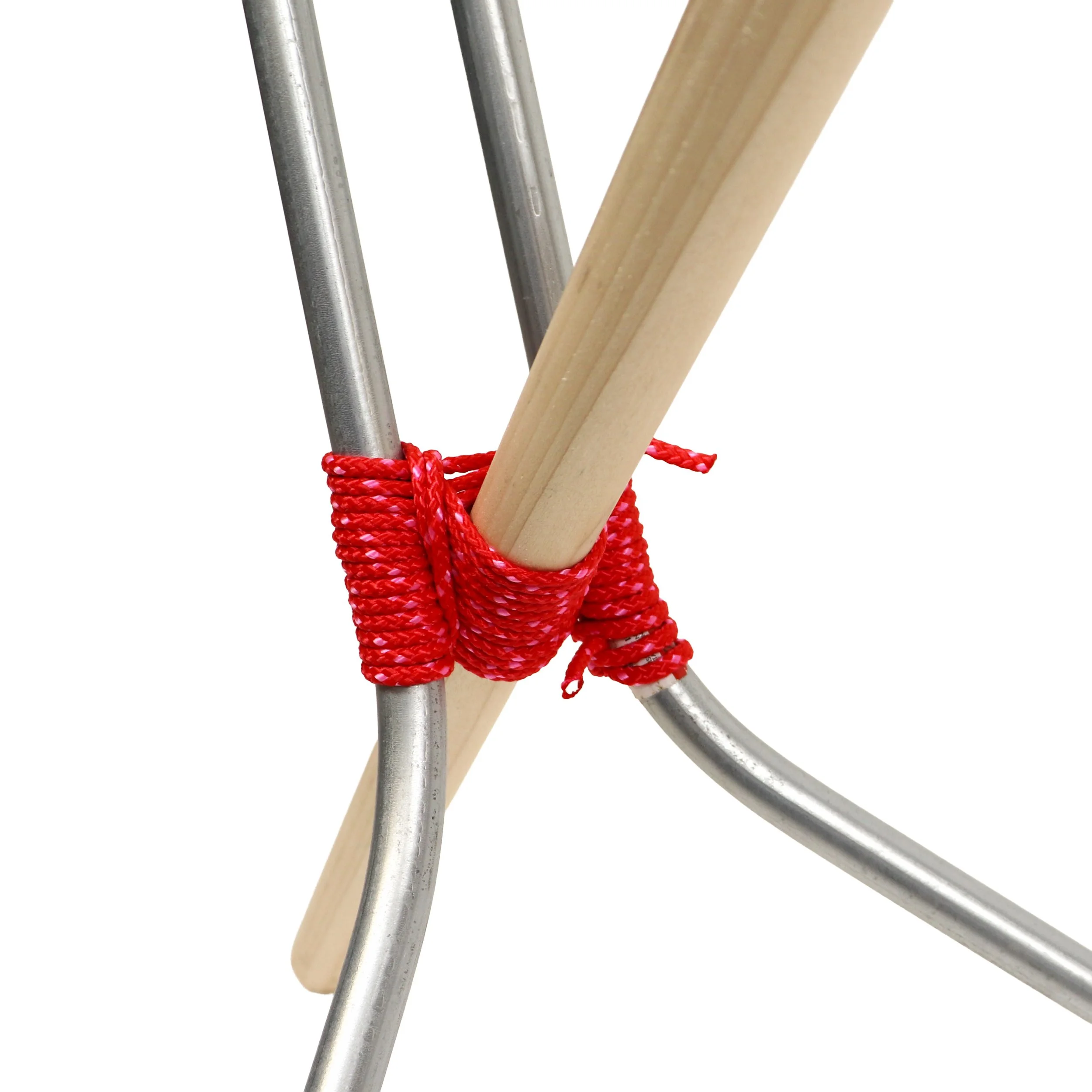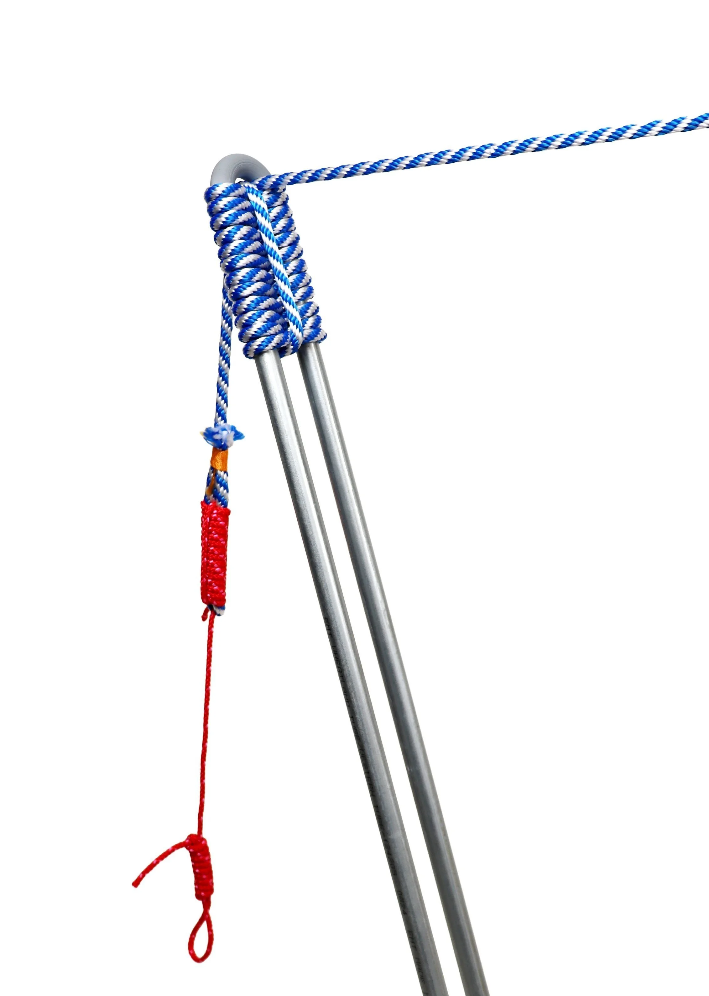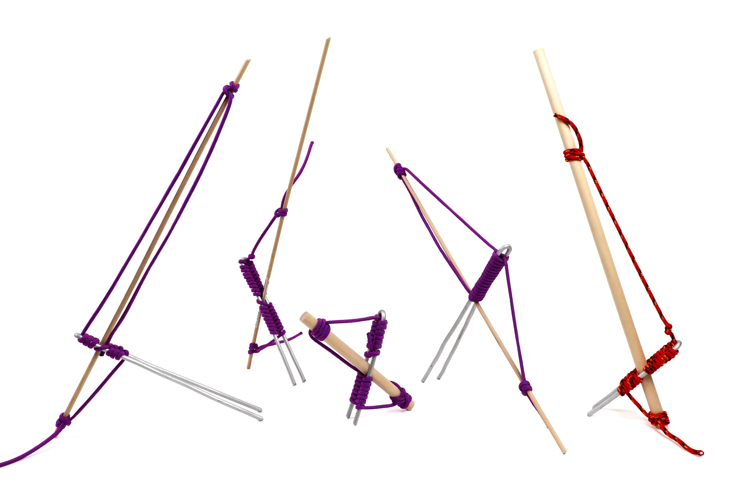 The metal tube legs are connected to the main dowel with a tripod lashing. Lashing knots are used to securely bind two or more objects together. Racking turns are interwoven between all three pieces. Frapping turns go around the racking turns at a right angle in between the components to tighten the lashing. The series of turns starts and ends with a clove hitch. This knot is tied flat and then the poles are twisted away from each other.