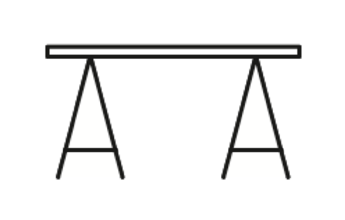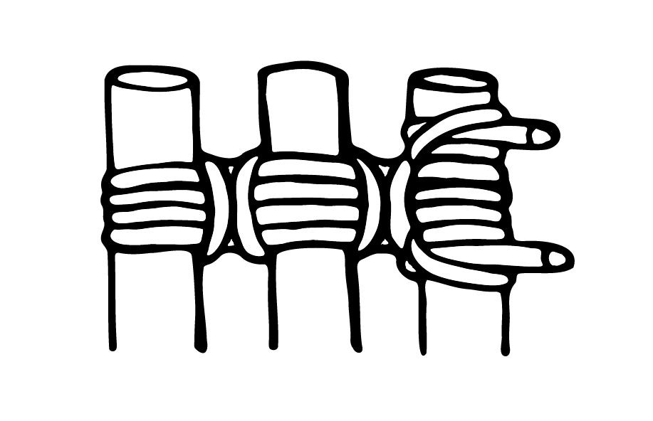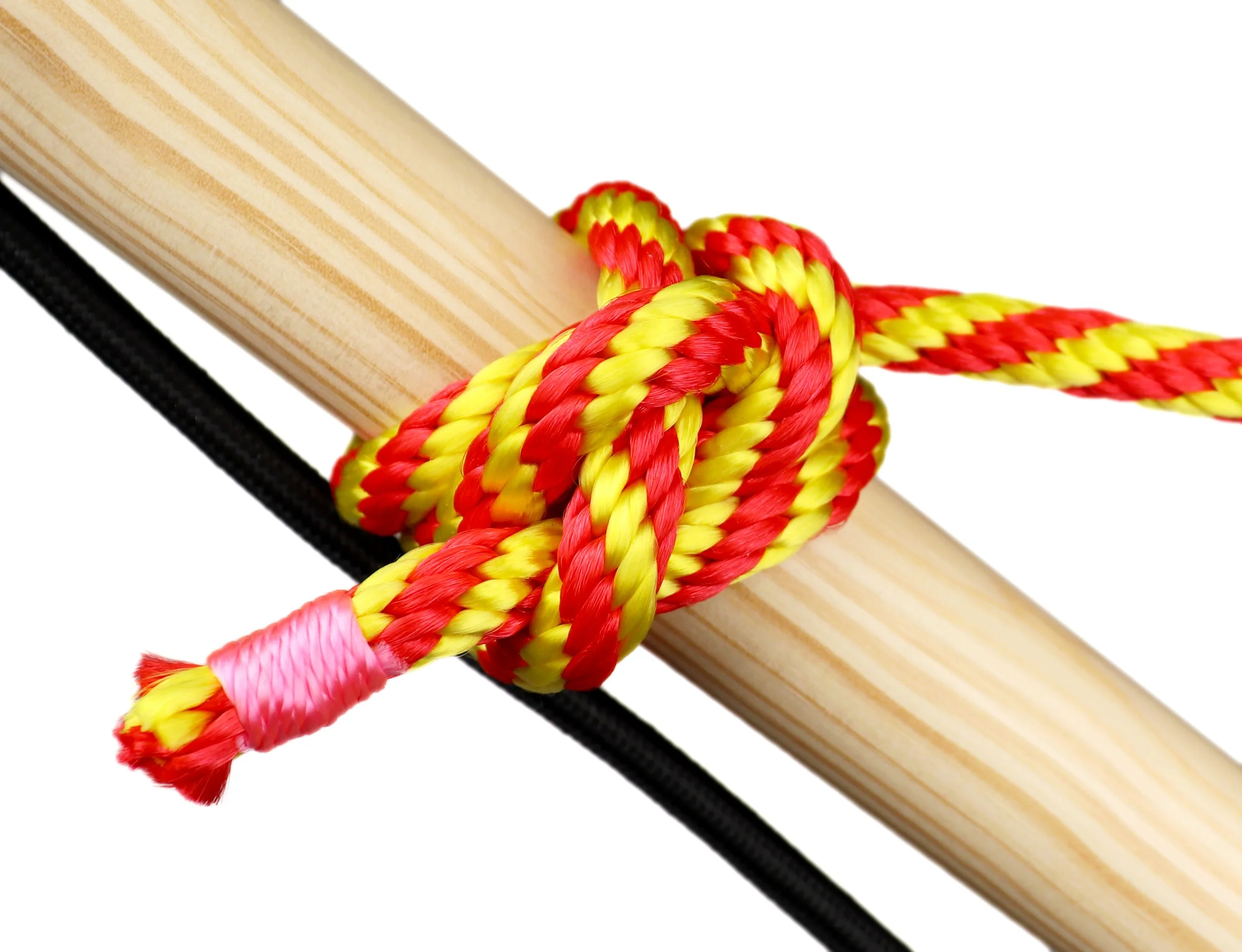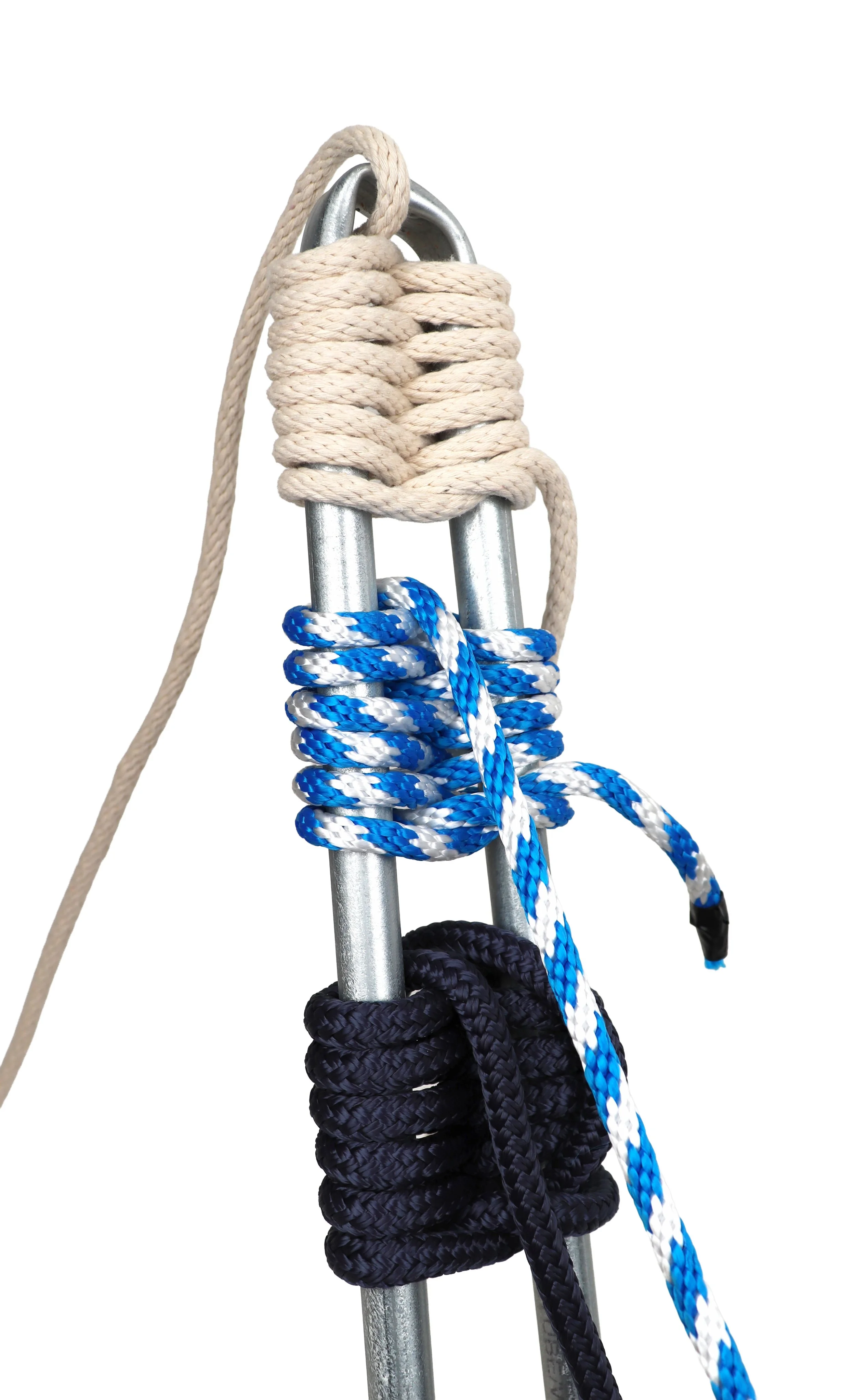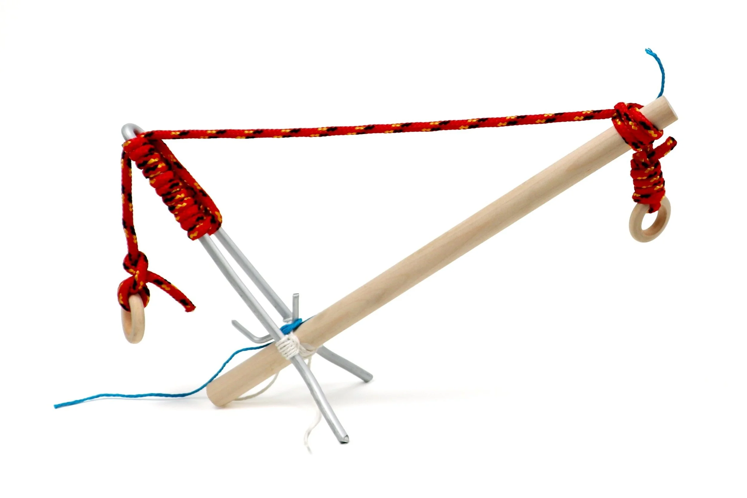 The metal tube legs are connected to the main dowel with a tripod lashing. Lashing knots are used to securely bind two or more objects together. Racking turns are interwoven between all three pieces. Frapping turns go around the racking turns at a right angle in between the components to tighten the lashing. The series of turns starts and ends with a clove hitch. This knot is tied flat and then the poles are twisted away from each other.