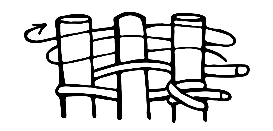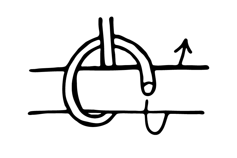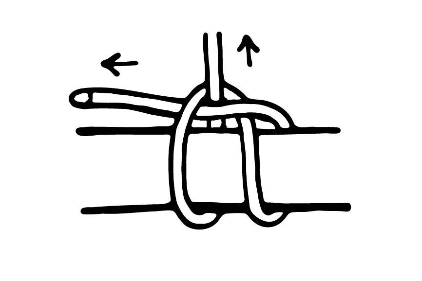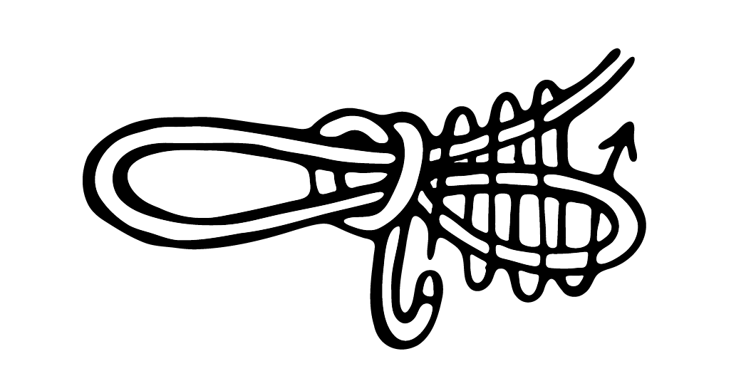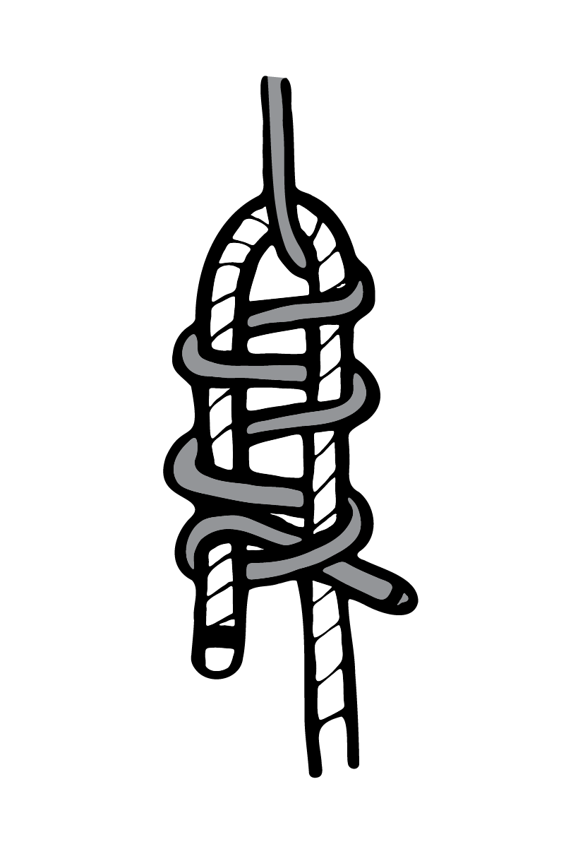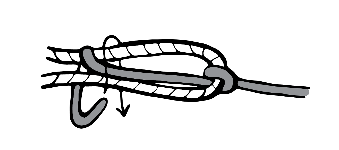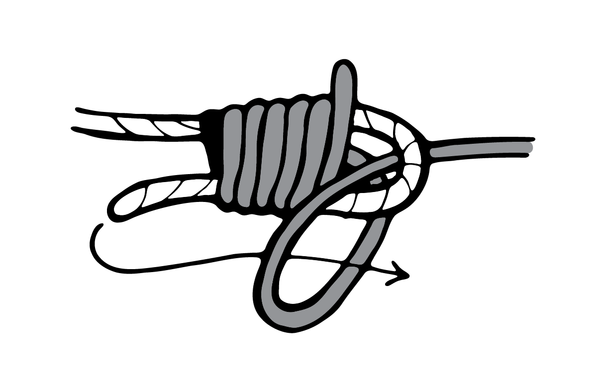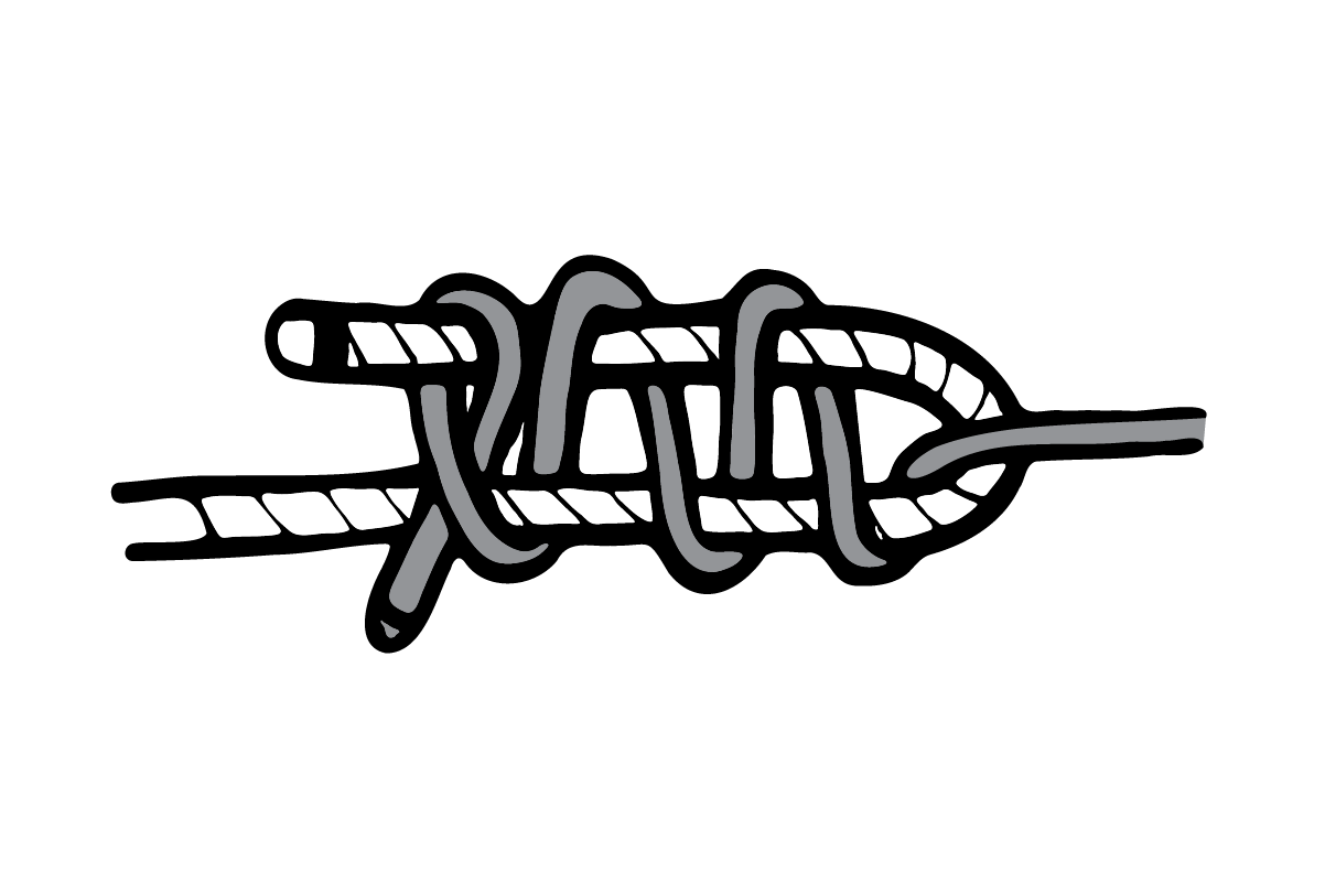 The main line begins with a boom hitch. This knot is primarily used on sail boats - a boom is a type of pole. It can take tension at right angles to the pole and also resists parallel pull in either direction, so it works well for this angled line. It is a simple knot to tie, using a series of consecutive wrapping turns and only one final tuck. It is nearly symmetrical and has a very neat look; it was described as a “decorative hitch” by knot expert Clifford W. Ashley.