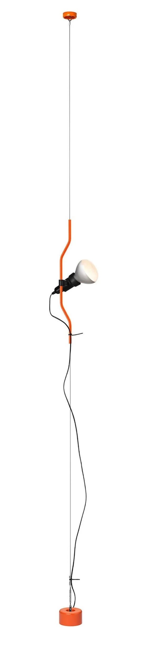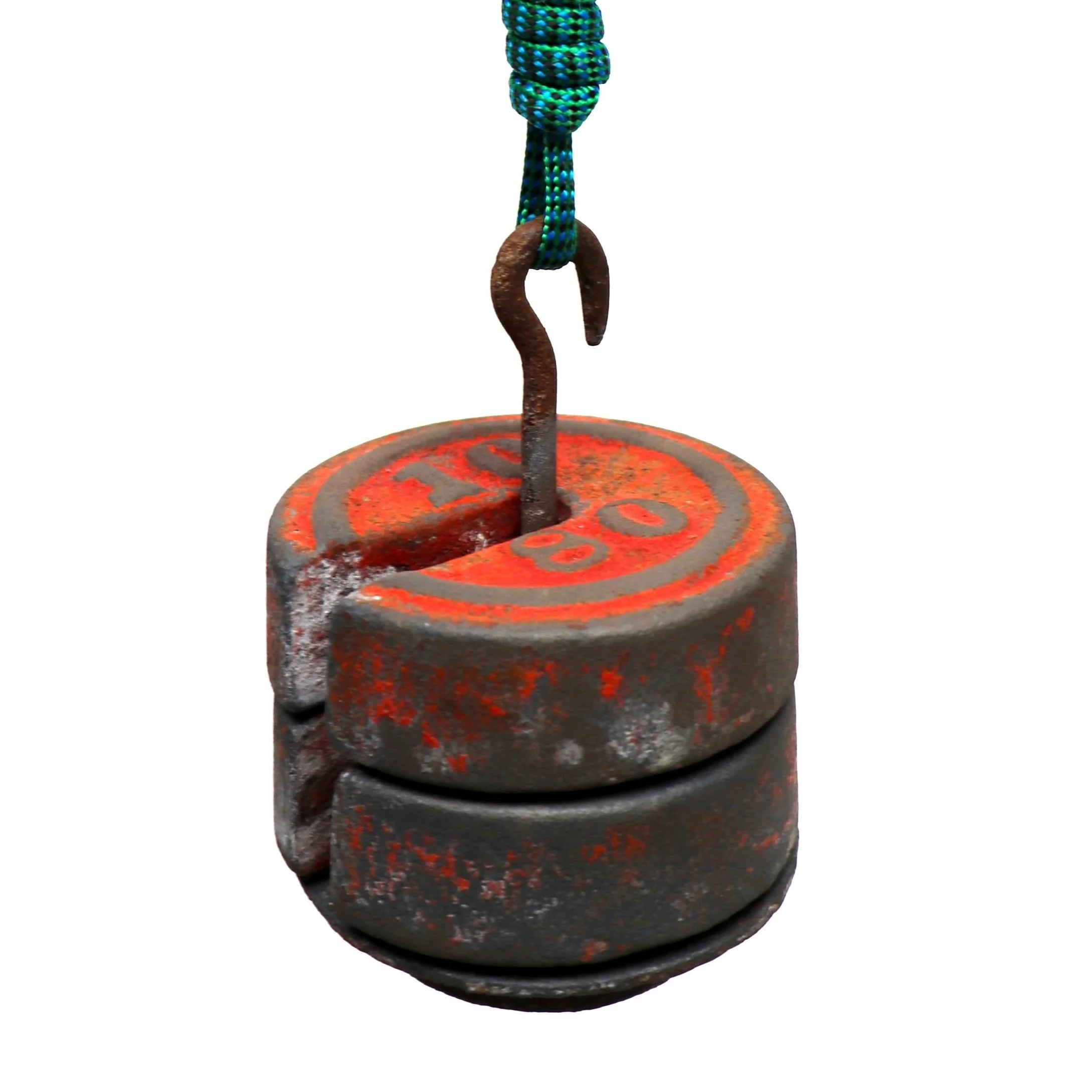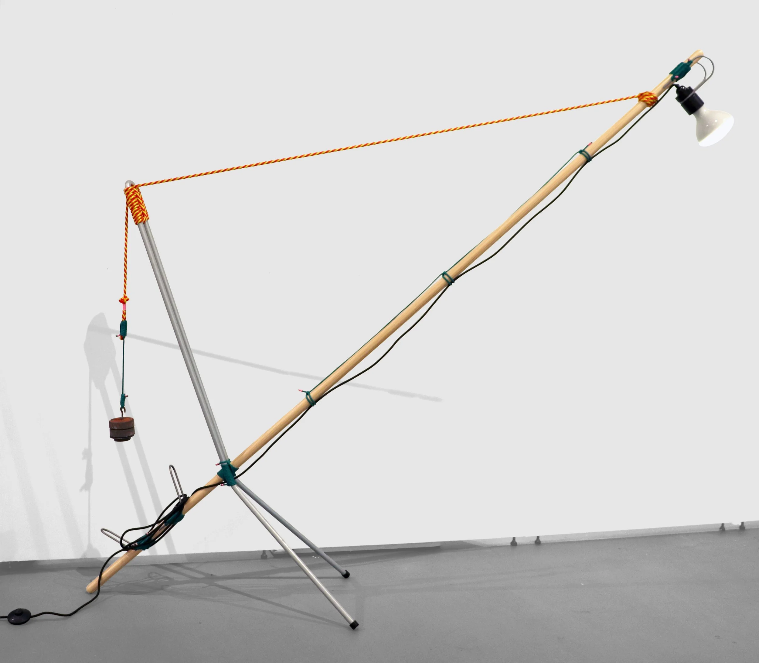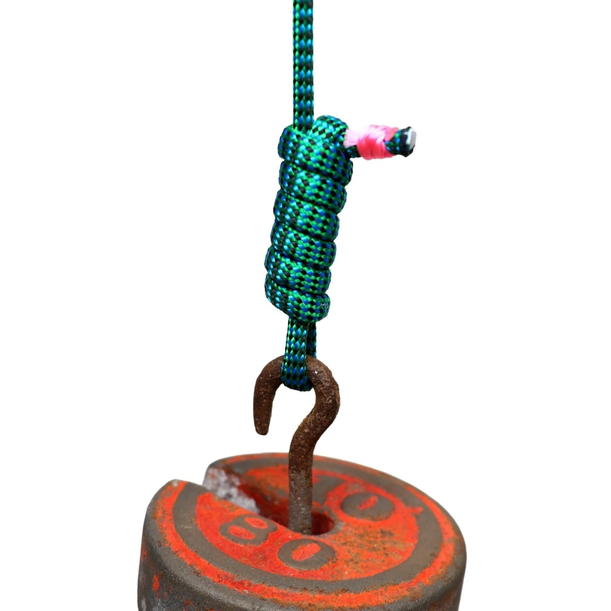 At the end of the main line is a hangman’s noose. It holds the weights that counter balance the extended lamp. This loop knot is adjustable or “slide-and-grip”, and the snug wrapping turns act as shock-absorption.