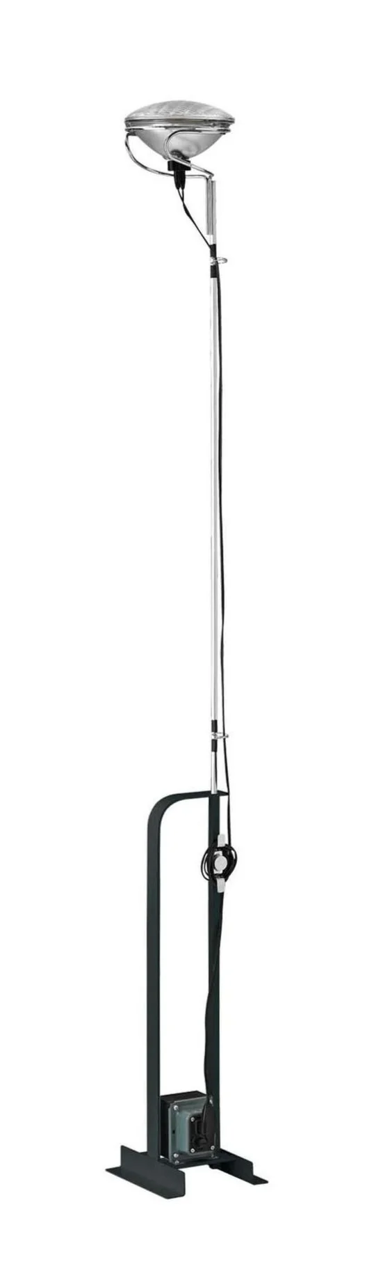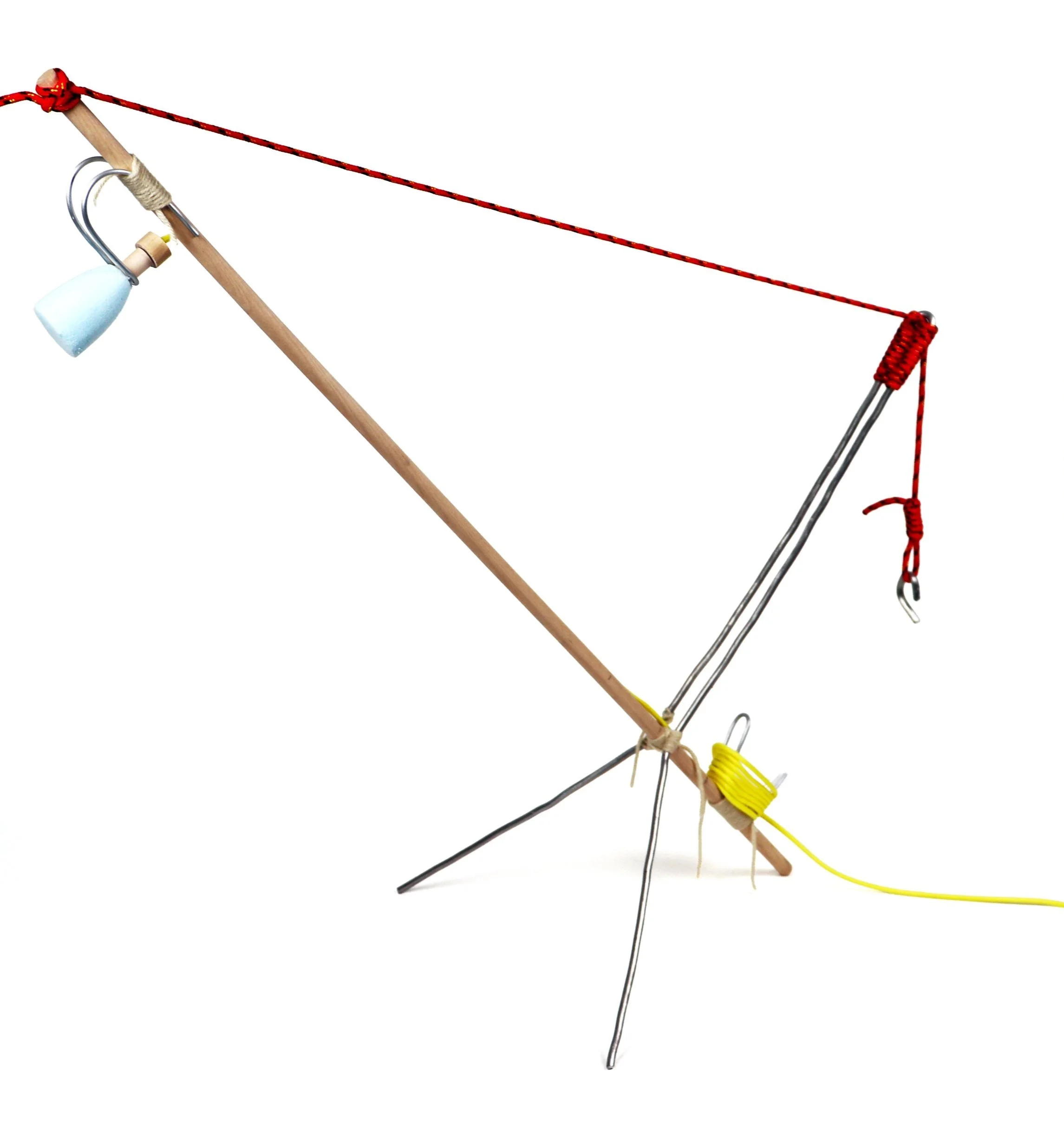 A tripod lashing knot is also used to attach a bent rod to the top end of the dowel. This piece holds the bulb and socket assembly. The socket closes around a polypropylene plastic socket cover. The deep ridge sits in the center bend of the steel.