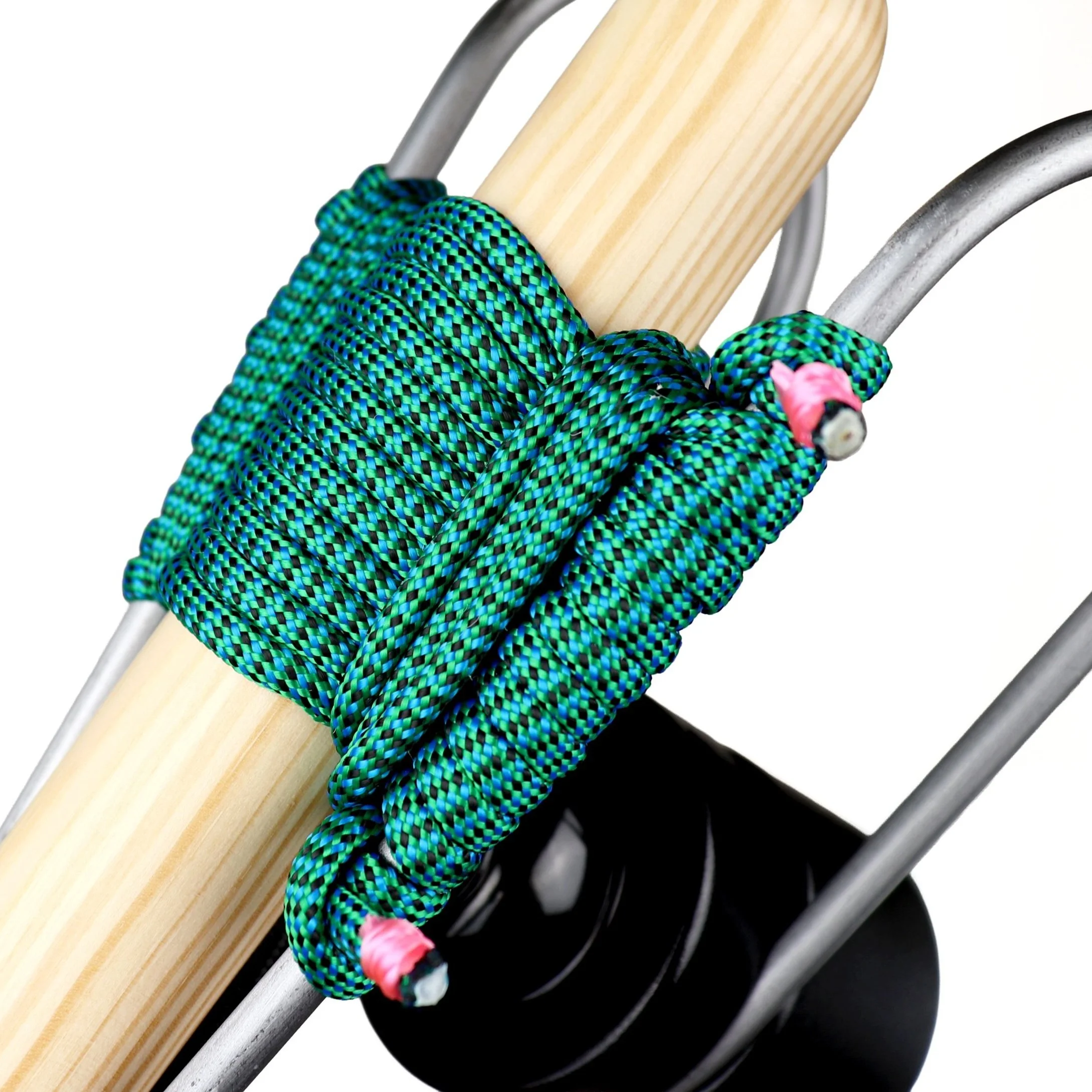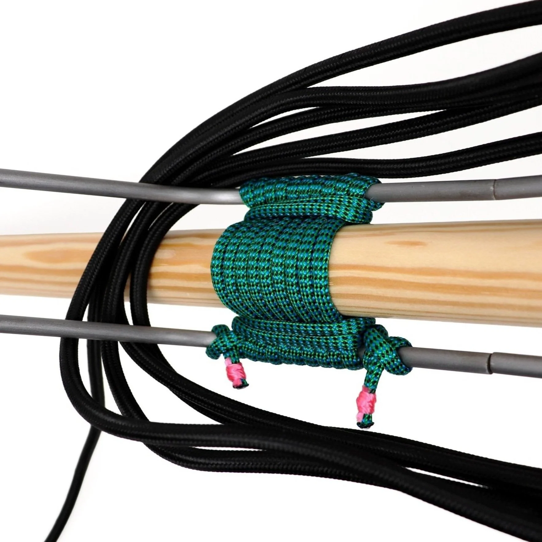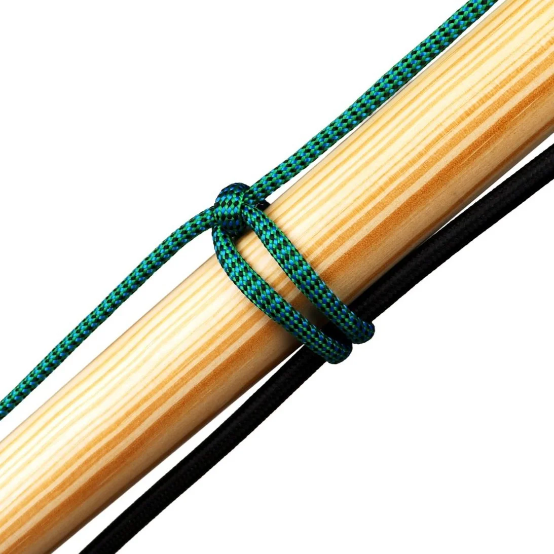 In between the lashings, the power cord runs along the length of the dowel. It is secured to the dowel with a series of three ossel hitches. “Ossel” is a Scottish sea fisherman’s word for a gill net. It works well in a sequence because the working end finishes parallel to the pole.