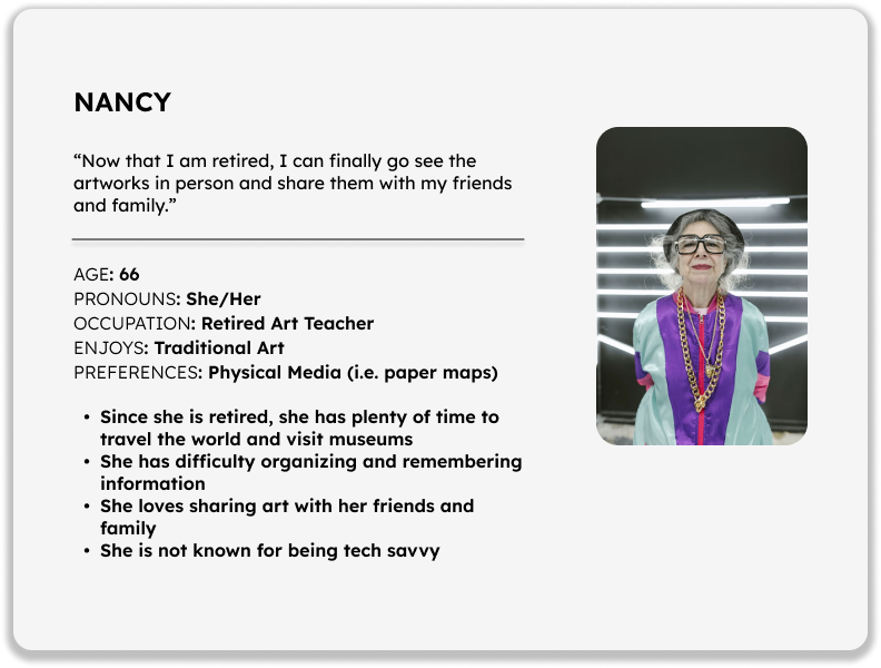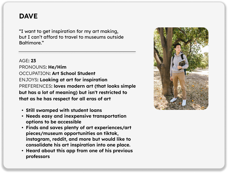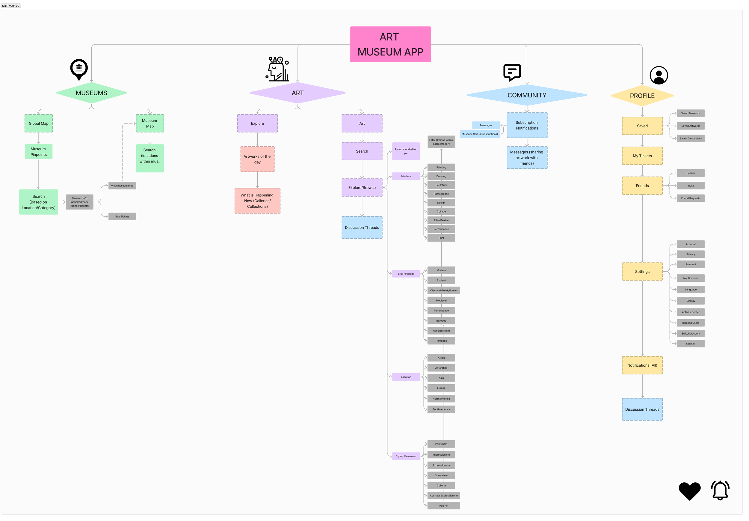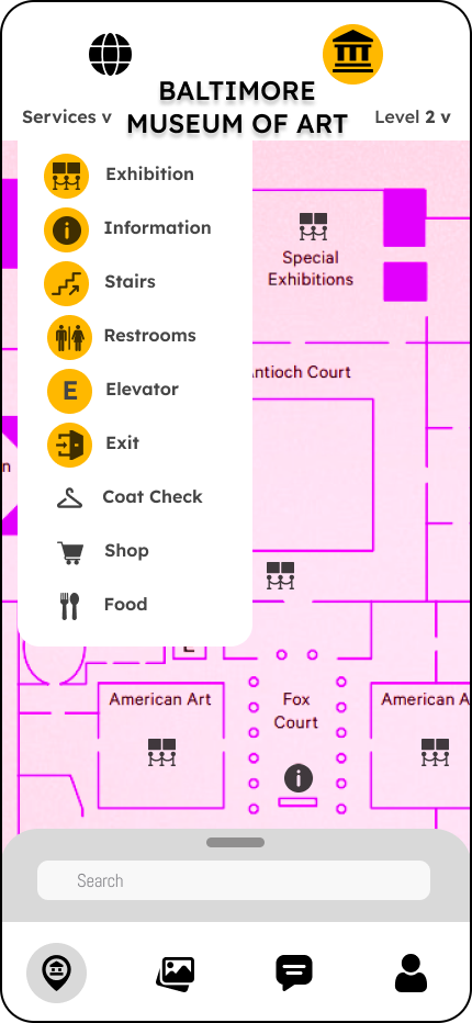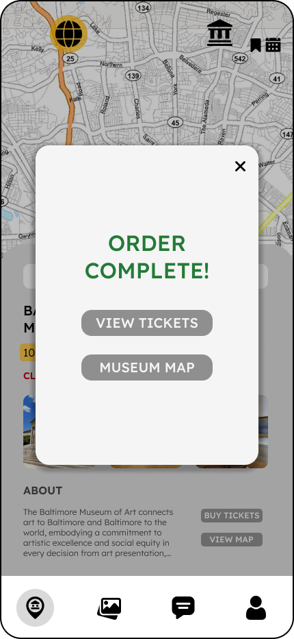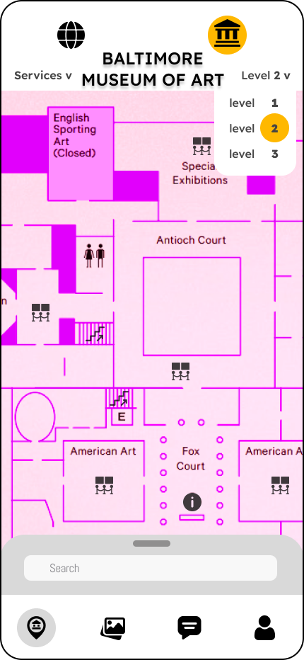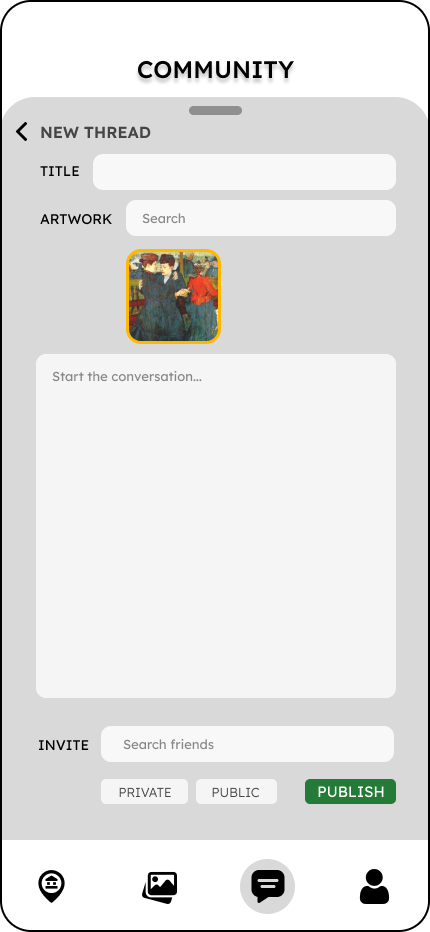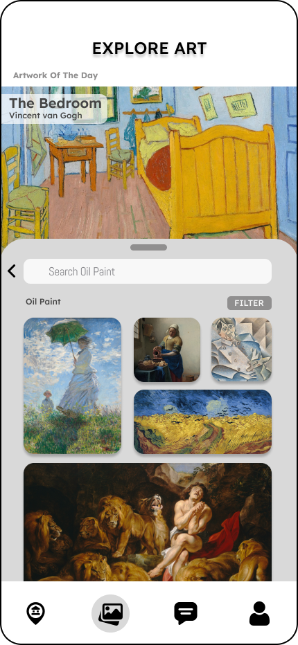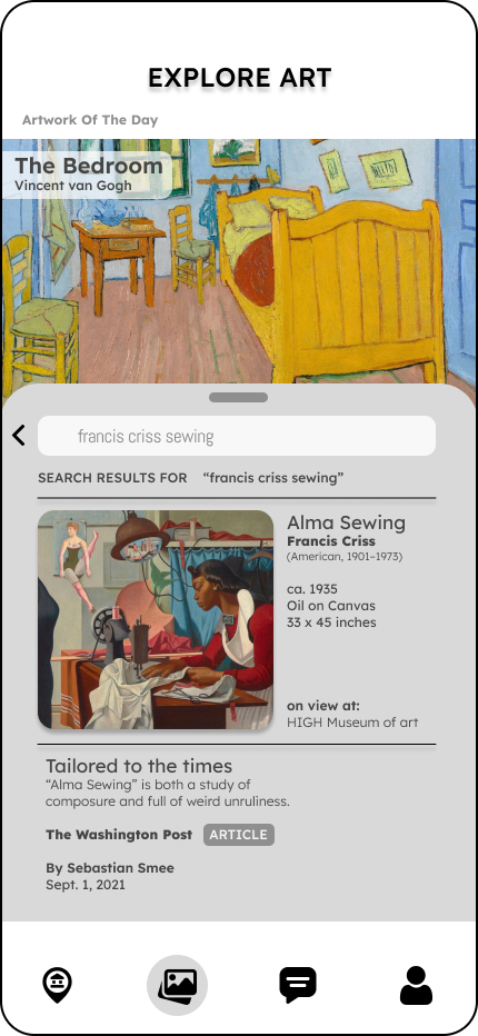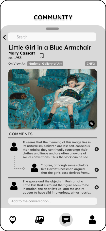 a phone app that allows users to find museum and gallery locations, easily navigate the museum internally, explore and learn about individual artworks digitally, save pieces to personal collections, as well as converse with others on artwork comment threads